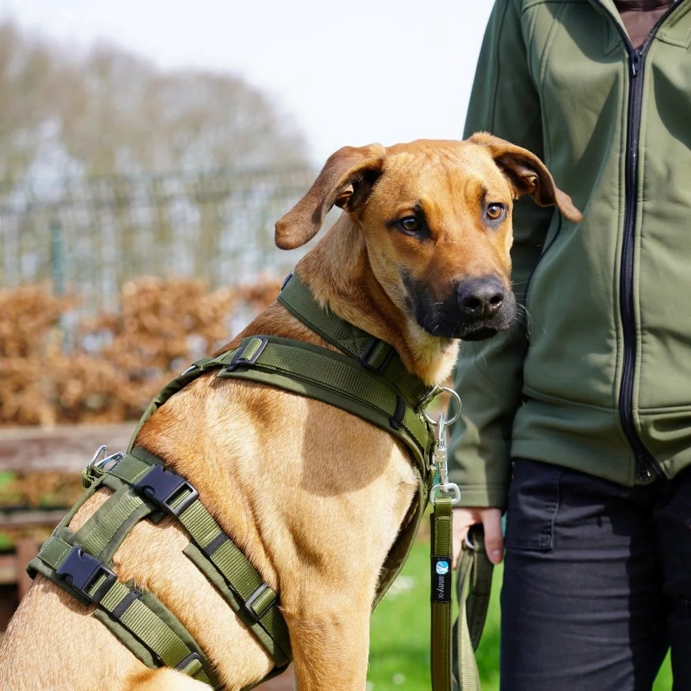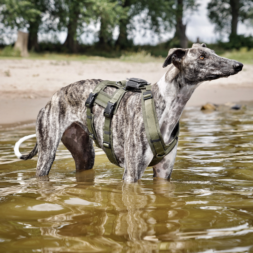 Die ergonomische Bauweise des Geschirrs sorgt für eine optimale Zugverteilung, die den Rücken Ihres Hundes schont. Um die Funktionalität zu gewährleisten, empfehlen wir, die Leine ausschließlich am dafür vorgesehenen Leinenring zu befestigen. Das Einhaken an anderen Ringen kann das Geschirr verziehen und zu einem erhöhten Verschleiß des Gurtbands führen.