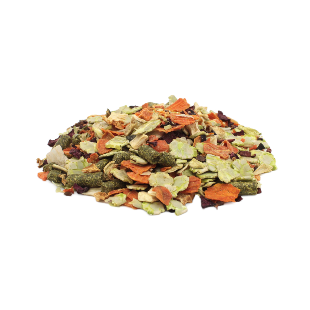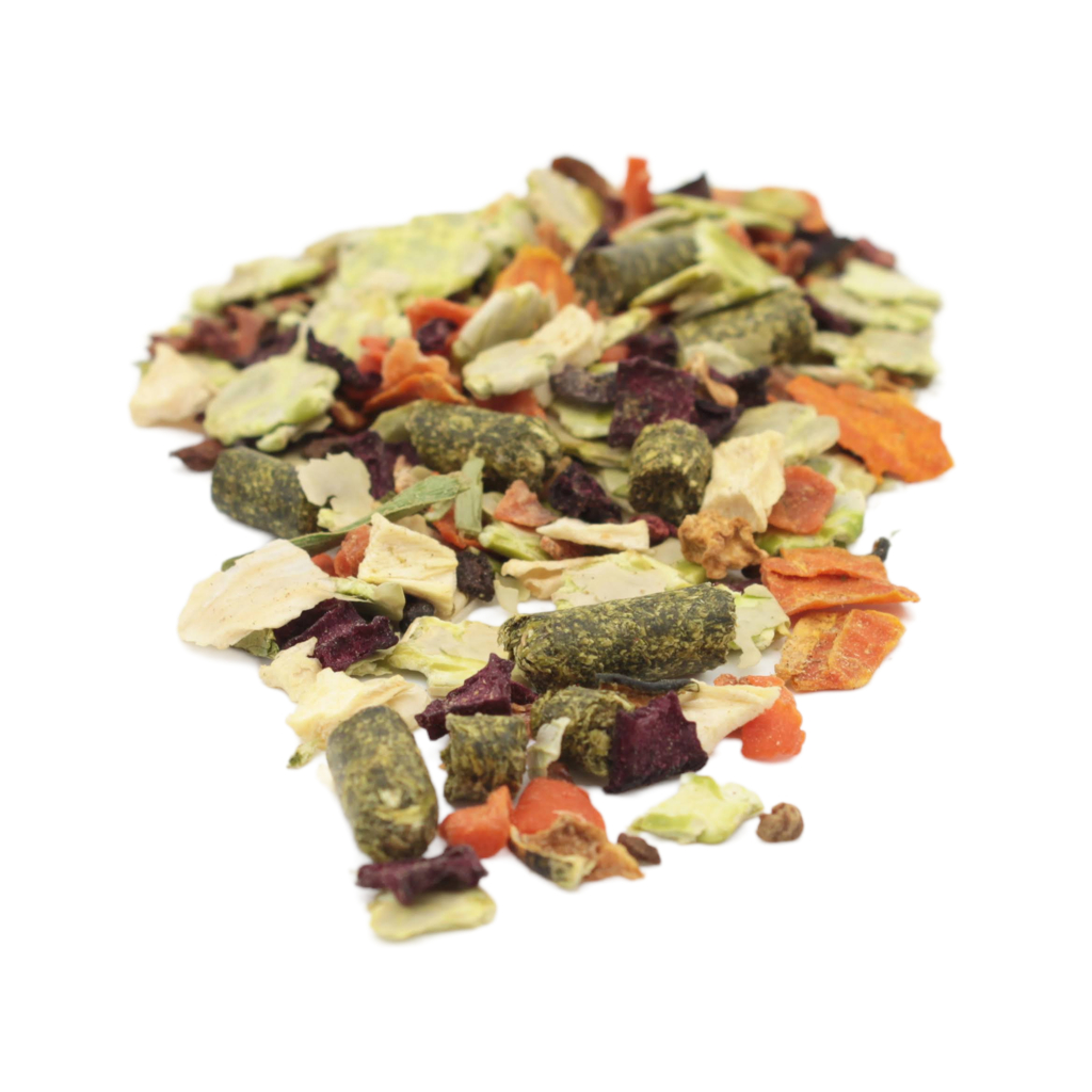 Erbsenflocken, Möhrenflocken, Luzerne getrocknet, Rote Bete getrocknet, Sellerieflocken, , Lauch getrocknet, Brennesselblätter, Enzianwurzel, Tausengüldenkraut, Beinwellwurzel, Kamillenblüten, Fenchel, Kümmel, Rhabarberwurzel, Kalmuswurzel geschält, Mistelkraut, Scharfgarbenkraut, Brombeerblätter, Leinsamen.