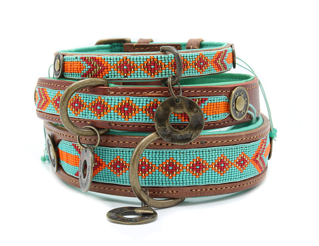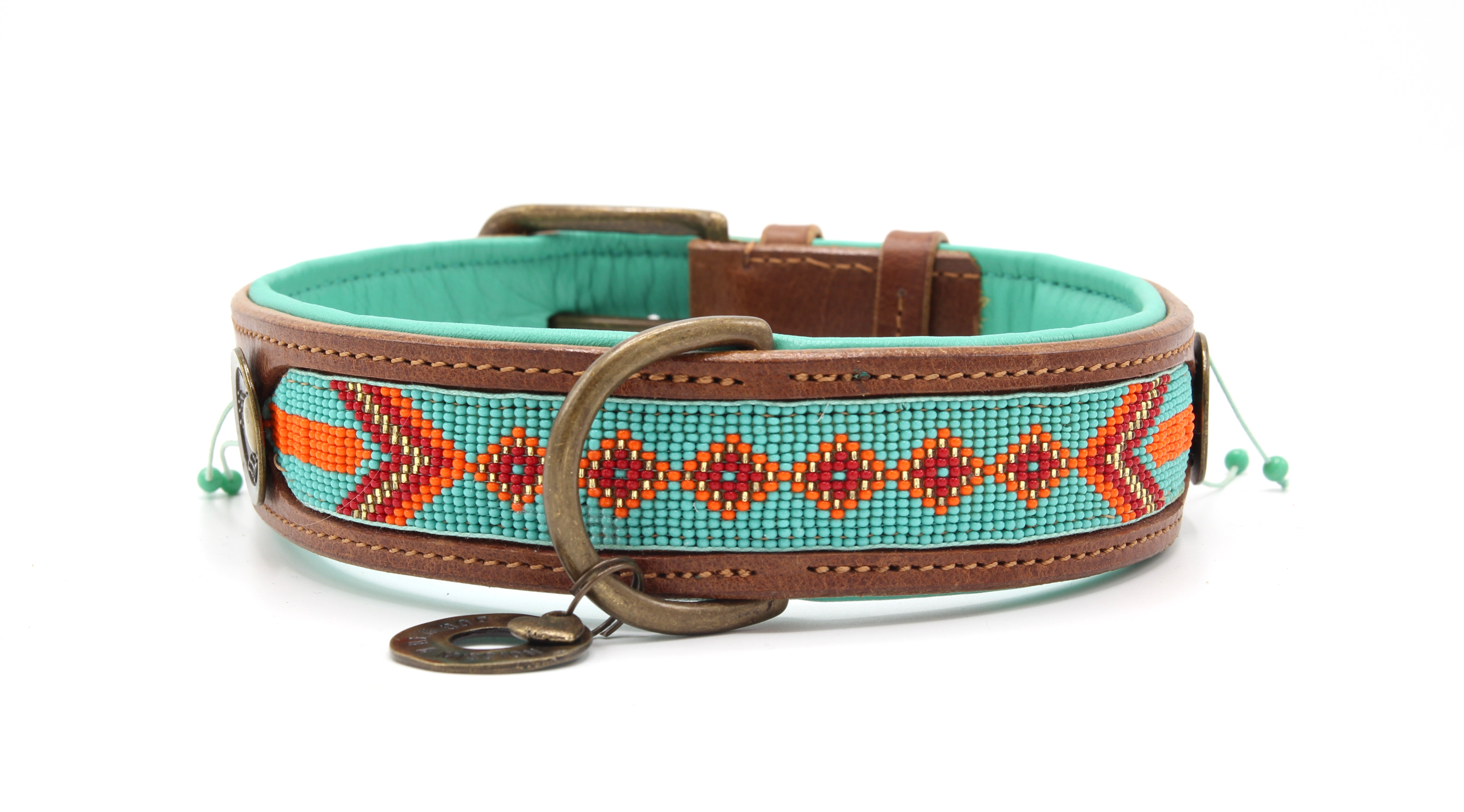 Das Paddy Lee ist ein schönes türkisfarbiges Perlenhalsband! Die Perlen sind fest ins Leder eingenäht. Die Innenseite wurde aus sanftem Türkisleder hergestellt. Ein absoluter Eyecatcher!