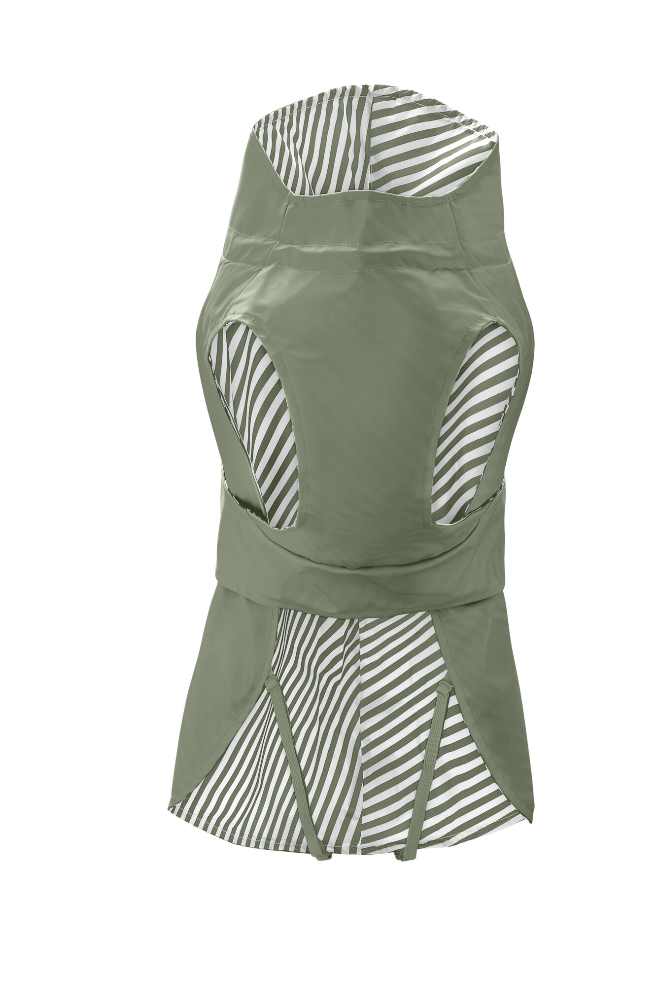 Der Mantel lässt sich ganz einfach und individuell mit einem breiten Klettband schließen, das auf dem Rücken angebracht ist und leicht angepasst werden kann, falls er zu weit oder zu eng sitzt. Zusätzlich verfügt der Mantel über eine Öffnung für den Ring eines Halsbandes und ist dank des wasserfesten, verstellbaren Zwei-Wege-Reißverschlusses auch ideal für die Verwendung mit einem Geschirr geeignet. Das ansprechende, gestreifte Innenfutter aus glattem Polyester sorgt dafür, dass das Tragen des Mantels äußerst angenehm ist – unabhängig davon, ob Dein Hund krauses, glattes, kurzes oder langes Fell hat.