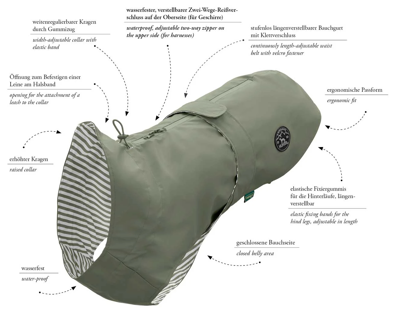 Bei der Gestaltung von MILFORD wurden selbstverständlich die speziellen Bedürfnisse von Hunden berücksichtigt. Die elastischen Bänder an den Hinterläufen gewährleisten einen optimalen Sitz, selbst bei starken Windböen. Der empfindliche Hals sowie der Rücken und Bauch Deines Hundes sind dank der ergonomischen Passform bestens geschützt, ohne dass die Bewegungsfreiheit eingeschränkt wird.