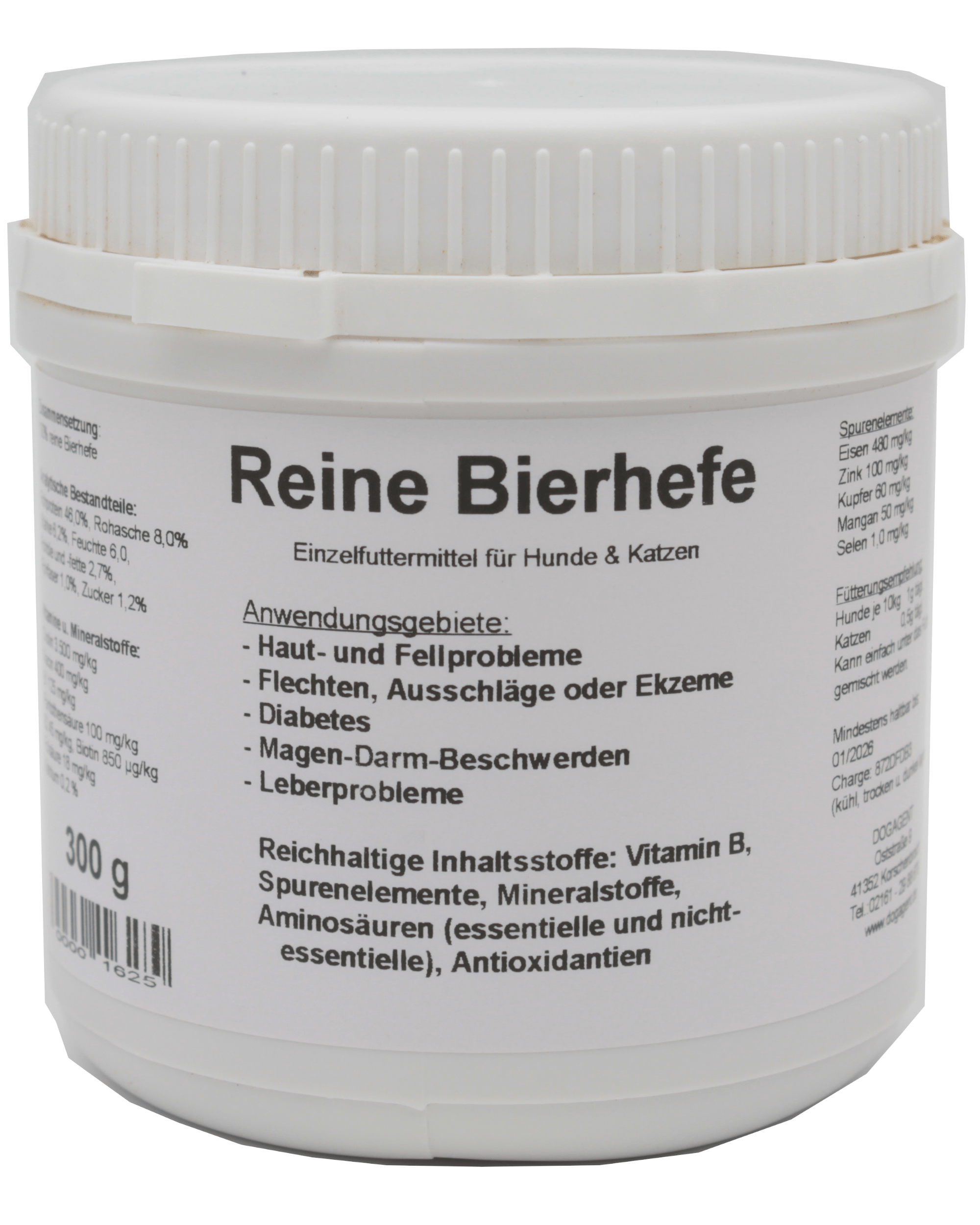 Unsere reine Bierhefe für Hunde ist eine natürliche und gesunde Ergänzung für das Wohlbefinden deines vierbeinigen Freundes. Reich an Vitaminen und Mineralstoffen unterstützt sie die Verdauung, stärkt das Immunsystem und fördert ein glänzendes Fell.